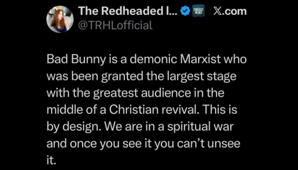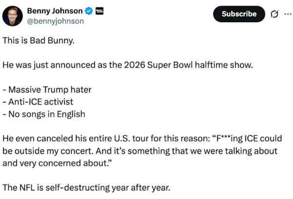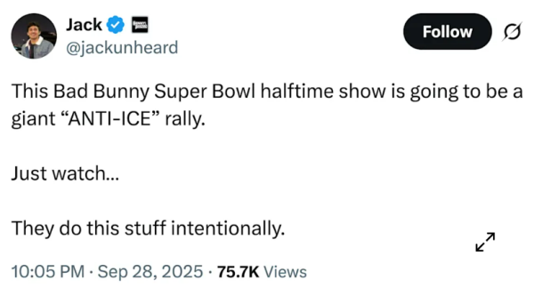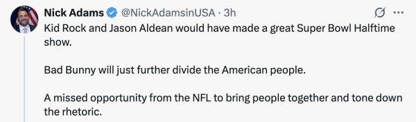 Scroll through X or Instagram, and, well, it’s difficult not to notice the recurring themes. “Not American enough,” “too foreign,” “we need a white performer,” “who even understands him?” Even our darling president, Trump, weighed in with his usual benevolence: “I’ve never heard of him. I don’t know who he is…I don’t know why they’re doing it…I think it’s absolutely ridiculous.” Just take a look at some of these posts on X.